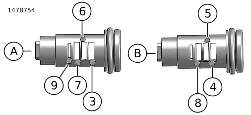 7. | Gambar 4 Pasang pegas tumbler (5), lihat Gambar 1 , ke dalam lubang di posisi 4,5 dan 8 di sisi (B) dari subrakitan silinder. | |