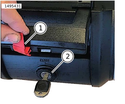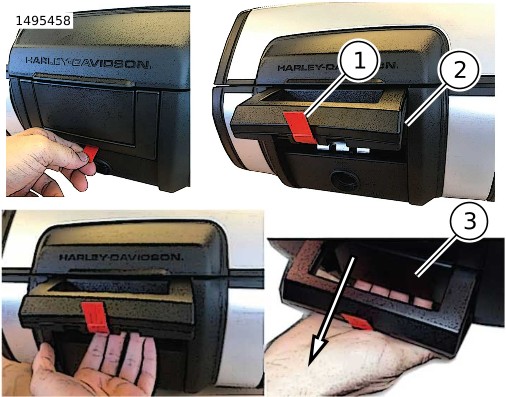 1. | Gambar 2 Buka bagasi atas dan temukan set kunci. a. Tarik tab merah (1) untuk melepaskan gagang (2). b. Tarik tuas (3) di bawah pegangan untuk membuka tutup. | |