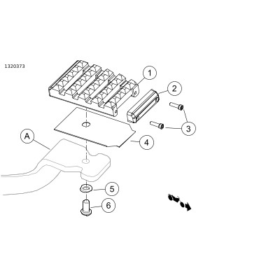 3. | Masukkan sekrup (6) melalui lubang di tuas rem kaki (A) dan ke dalam bagian belakang bantalan pedal rem (1). Kencangkan. Torque: 26 N·m (19 ft-lbs) |
