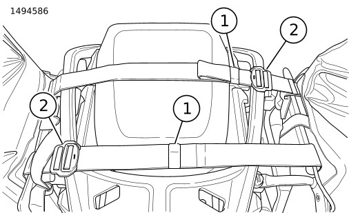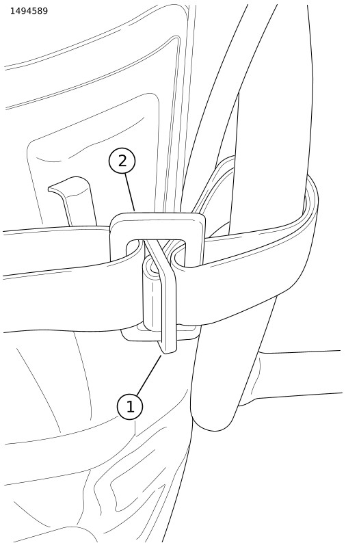 2. | Pasang sekrup (2) dan mur pelat kait (3). Kencangkan sekrup. Torque: 9,5 N·m (7 ft-lbs) Sekrup braket penopang | |||||||