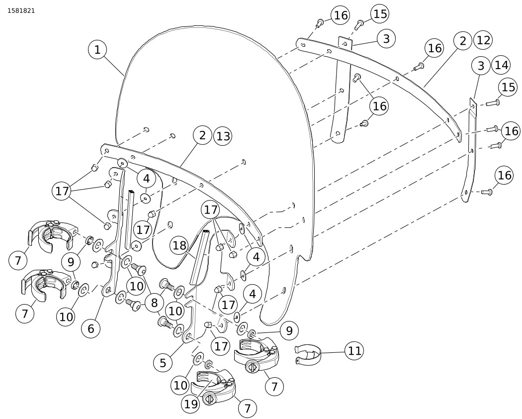 | 3. | Dengan pengapit menghadap ke atas dan luar pendakap perisai angin (2), ketatkan bolt bahu (1) cukup untuk memegang pengapit pada tempatnya. Bolt akan diketatkan sepenuhnya kemudian. |