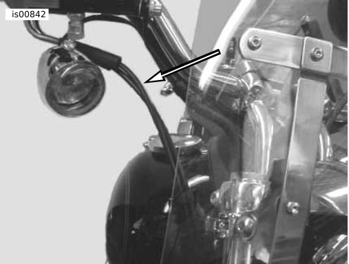 | 2. | Τυλίξτε το μπροστινό φτερό και ελέγξτε για να βεβαιωθείτε ότι τα καλώδια γκαζιού είναι τοποθετημένα μεταξύ του ζεύγους σφιγκτήρων στα αριστερά σας (όπως βλέπετε τη μοτοσικλέτα, κρατώντας τον ανεμοθώρακα) και ότι δεν θα συμπιεστούν από τους σφιγκτήρες. Κεντράρετε τον ανεμοθώρακα γύρω από τον προβολέα και τοποθετήστε τους σφιγκτήρες πάνω στους ολισθητήρες πιρουνιού. | |