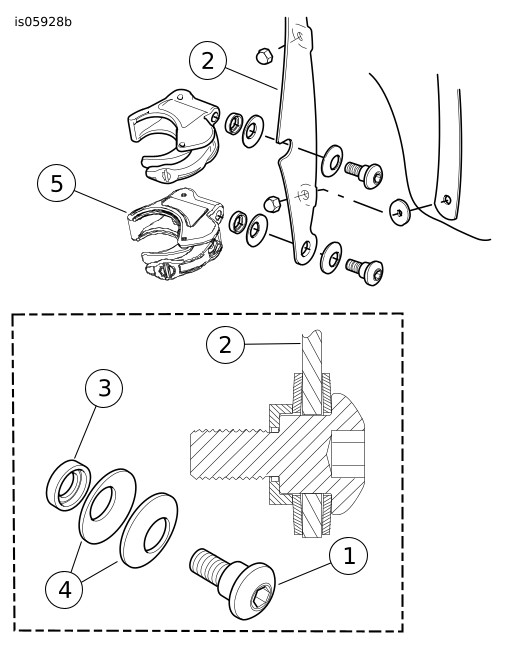| 8. | Kad vējstikla skavas ir pievilktas pie dakšas slīdņiem, pārliecinieties, lai plecu skrūvju pleca daļa būtu pilnībā nostiprinājusies katrā vējstikla kronšteina vietā. Pievelciet katru plecu skrūvi. Griezes moments: 6,7 N·m (60 in-lbs) Plecu skrūve | |||||||||||||
