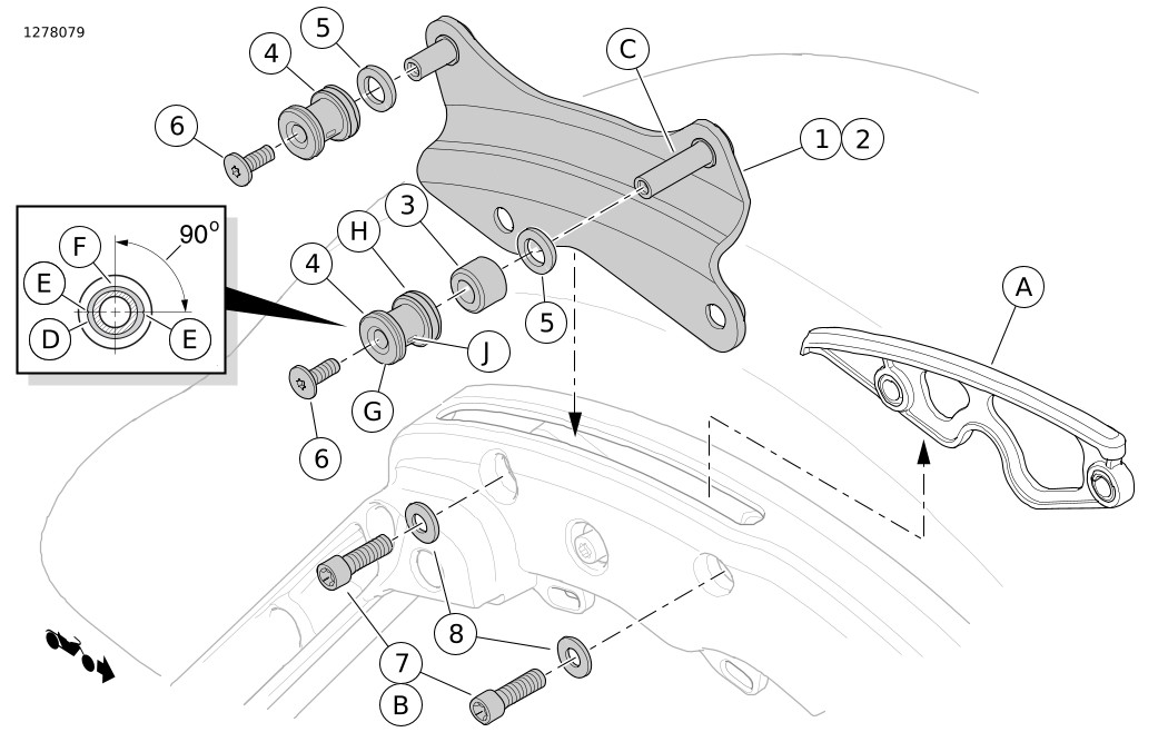 6. | הערה הסר את חומר נעילת התבריגים מבורגי נקודת העיגון ומהתבריגים של חורי ההרכבה, לפני מריחת חומר לנעילת תבריגים על תבריגי הברגים. a. הסר את הברגים (6) מכל ארבעת הפינים של לוחית העיגון. b. סובב כל אחת מנקודות העיגון עד שהמגרעת השנייה מגיעה למצב (E). c. שים 2 או 3 טיפות של חומר לנעילת תבריגים על התבריגים של כל אחד מהברגים (6).LOCTITE 243 MEDIUM STRENGTH THREADLOCKER AND SEALANT (חומר בדרגה בינונית לאטימה ולנעילת תבריגים; כחול) (99642-97) d. התקן ברגים ותותבי מרווח (אם קיימים). הדק עם האצבעות כך שיהיה הדוק. e. בדוק את האביזר הנתיק בכל נקודת עיגון, תוך סיבוב המגרעת לעבר (F) עד שתושג הצמדה הדוקה של האביזר הנתיק בכל מיקום. f. אבטח את הברגים (6). הדק. מומנט סיבוב: 14.2 N·m (126 in-lbs) | |