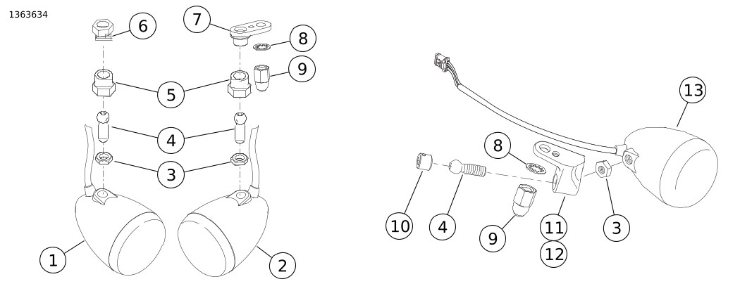 7. | התקן את מאותת הפנייה הקדמי. a. התקן את התושבת של מאותת הפנייה (11 או 12), דסקית הנעילה (8) ואום הכיפה (9) על המראה. b. כוונן את המראה והדק את האום (9). מומנט סיבוב: 10.8–16.3 N·m (96–144 in-lbs) אום הרכבה של מראה c. התקן את הפין עם הכדור בקצה (4) על מאותת הפנייה (13) והדק את אום הנעילה (3). מומנט סיבוב: 5.6–7.9 N·m (50–70 in-lbs) אום נעילה של פין עם כדור בקצה d. ודא שמאותת הפנייה מוצב בצורה נכונה. e. התקן והדק את בורג הנעילה (10). מומנט סיבוב: 4–6.7 N·m (35–59 in-lbs) אום נעילה של פין עם כדור בקצה |