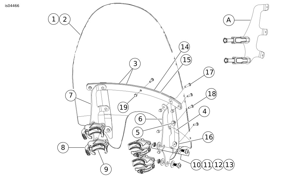 2 | פרופיל נמוך, שמשה קדמית, מעושנת, נורה כפולה | 57341-08 | 12 | ערכת חומרה, כן שמשה (4) (כוללת פריטים 13 עד 15) | 58790-04 | |