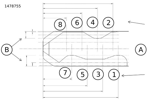 7. | איור 4 התקן את קפיצי הפינים (5), ראה איור 1 , בתוך החורים בנקודות העצירה 4, 5 ו-8 בצד (B) של תת-מכלול הצילינדר. | |