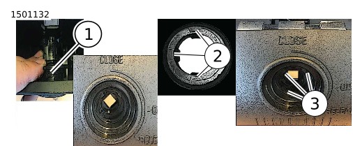 3. | איור 8 התקן את המנעול. a. הצב את חריץ פין הנעילה (1) במיקום השחרור (2). b. הזיז הרבוע במנעול חייב להשתלב עם הפתח הרבוע ברוטור (3). c. החזק במקום בכוח היד. | |