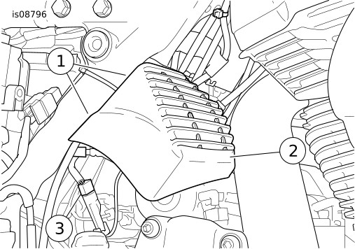 a. Lepaskan pengikat kabel dari kabel dan rangka. b. Putar penutup busi atas (3) ke arah sisi kiri kendaraan. c. Putar penutup busi bawah (3) ke arah sisi kiri kendaraan. d. Arahkan ulang kabel. Pasang pengikat kabel (2) jika diperlukan. |