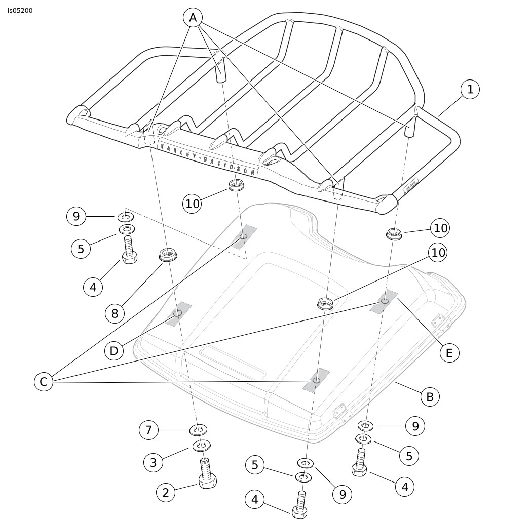 | 2. | ראה איור 1 . החלק את רפידת ההתקנה בעלת הקוטר הגדול יותר (8) על הרגל השמאלית-האחורית. החלק את שלוש רפידות ההתקנה בעלות הקוטר הקטן יותר (10) על כל אחת מרגלי ההתקנה הנותרות (A). עם השם הארלי-דייווידסון מאחור, מקם את המתלה על מכסה הטור-פאק במיקום הרצוי. הערה מרכזו בזהירות את המתלה משמאל לימין, ומקמו את המתלה בריבוע על המכסה לקבלת המראה הטוב ביותר. אין להרכיב את המתלה רחוק מדי קדימה כדי למנוע מגע עם כרית משענת הגב. | |