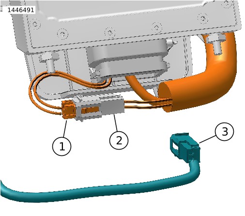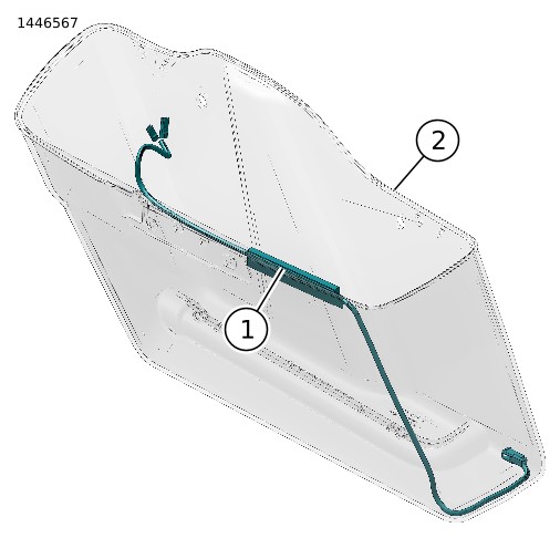 6. | Gambar 9 Hubungkan harnes 69202531 (1) dan 69202563 (2) bersama-sama. a. Hubungkan ujung 69202531 4 arah (1) ke konektor harnes amplifier primer [351A] di bawah penutup sisi kanan. | |