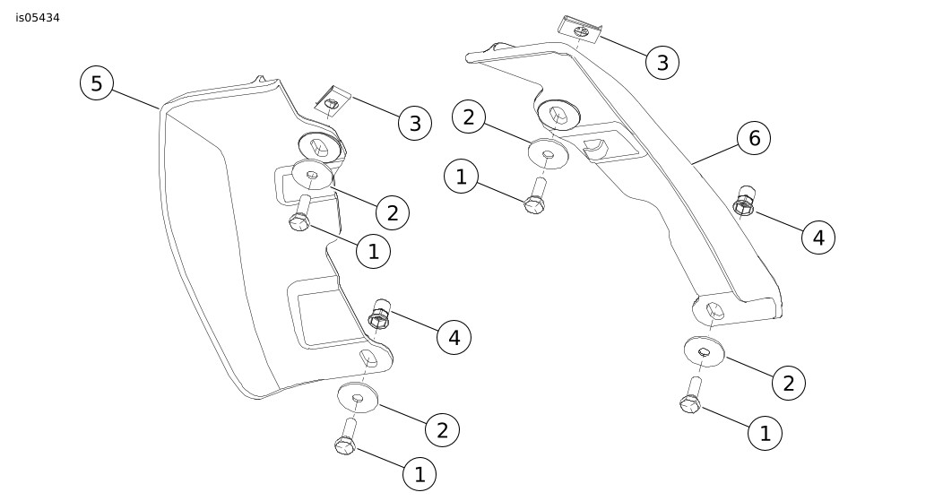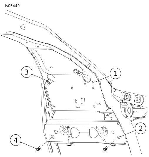 3. | התקן את מסיט זרימת אוויר למסגרת האמצעית (3, 4). הערה אסור להשתמש ב-LOCTITE® על המהדקים מכיוון שעלול להיגרם נזק למסיטי זרימת האוויר. שים את מסיט זרימת האוויר השמאלי מאחורי חוט מצת הלהט וצינור פליטת האוויר, אם קיים. | |
