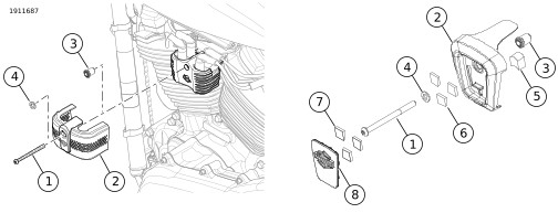 | 3. | ערכות 57300416, 57300417, 57300418: התקן כיסוי סליל מעל הסליל. הערה ודא שמכסה הסליל עוטף את החלק העליון של חבילת הסליל בעת הידוק בורג (1). a. התקן בורג (1), דיסקית (4), כיסוי סליל (2), ספייסר (3) ופד (5). b. הדק את הבורג (1). מומנט סיבוב: 17.6–18.9 N·m (13–14 ft-lbs) c. התקן אינסרט (8) לכיסוי סליל (2). | |