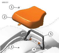 | 6. | Pasang bagian belakang sadel penumpang belakang ke spatbor. a. Masukkan tab sadel ke dalam mur sepatbor (3). b. Pasang sekrup sadel (1). Kencangkan. Torque: 5,4–8,1 N·m (48–72 in-lbs) Sekrup Sadel | |