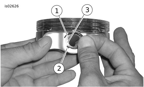 8. | ראה איור 3 . הכנס את הקצה הפתוח של המעגל (1) לתוך חריץ (2) בחריץ (3) סביב הבוס של פין הבוכנה, כך שהרווח יהיה במצב 12:00 או 6:00 בעת ההתקנה. |