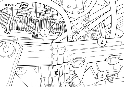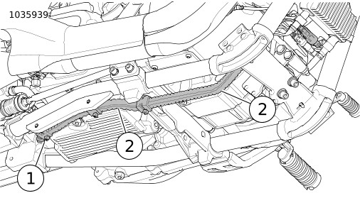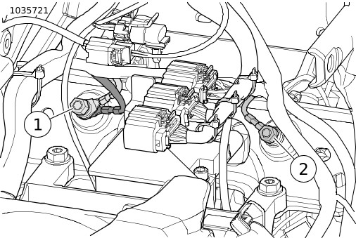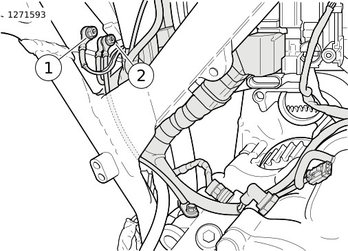 | 14. | ראה איור 44. חיישן החמצן הקדמי (כבל חיבור ארוך של הרתמה): a. נתב את רתמת החיווט של המחבר מחוץ לתא המצבר, דרך צדו האחורי. b. אתר את רתמת החיווט הראשית (1) המובילה למוביל רתמת החיווט (2). c. נתב את רתמת החיווט לאורך המארז של רתמת החיווט הראשית (2) לעבר המחבר של חיישן החמצן הקדמי. d. חבר את מחברי החיישן. | |||||||||