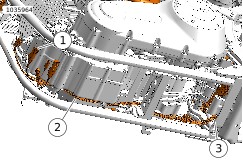 | 12. | ראה איור 43. נתב את רתמת החיווט של המחבר האפור מחוץ לתא המצבר, דרך הצד האחורי שלו: a. אתר את רתמת החיווט הראשית (1) המובילה למוביל רתמת החיווט (2). b. נתב את רתמת החיווט בעלת המחבר האפור לאורך מוביל רתמת החיווט הראשית לעבר המחבר הקדמי של רתמת החיווט הראשית. c. התאם את צבע המחברים (3): אפור לאפור. | |||||||||
