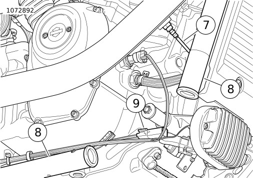 | 16. | ראה איור 8. חיישן חמצן קדמי (5, כבל החיבור הארוך של הרתמה): a. מהחיישן הקדמי, נתב וקבע את רתמת החיווט של חיישן החמצן לאורך הצד הפנימי של הצינור התחתון הימני של המסגרת. התקן אזיקונים לפי הצורך. b. נתב וקבע את רתמת החיווט לאורך הצד הפנימי של המסגרת התחתונה לעבר מחבר חיישן החמצן. התקן אזיקונים לפי הצורך או השתמש בחבקים ובסוגרים הקיימים. c. חבר את מחברי חיישן החמצן. | |||||||||||||