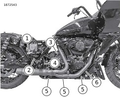 | 16. | ראה איור 16. חיישן חמצן קדמי (5, כבל החיבור הארוך של הרתמה): a. מהחיישן הקדמי, נתב וקבע את רתמת החיווט של חיישן החמצן לאורך הצד הפנימי של הצינור התחתון הימני של המסגרת. התקן אזיקונים לפי הצורך. b. נתב וקבע את רתמת החיווט לאורך הצד הפנימי של המסגרת התחתונה לעבר מחבר חיישן החמצן. התקן אזיקונים לפי הצורך או השתמש בחבקים ובסוגרים הקיימים. c. חבר את מחברי חיישן החמצן. | |||||||||||