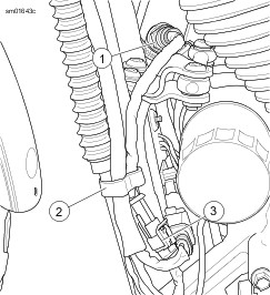 | 11. | הערה במודול המכוון האוטומטי (ATM) יש ארבעה כבלי חיבור וחוט הארקה. a. התחל בפינה הימנית הקדמית של אזור תיבת המצבר. b. החלק את רתמת החיווט של המחבר האפור או השחור (1) בין צינורות הבלמים (2) לבין מסילת המסגרת (3). c. החלק את רתמת החיווט של המחבר לאורך עד שתצא מאזור תיבת המצבר ותיכנס לאזור כיסוי הצד. d. חזור על ההליך ברתמת החיווט של המחבר השני. |