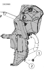 4. | See Figure 1. אתר את הפיירינג תחתון החיצוני השמאלי (11) מהערכה. a. See Figure 6. התקן את עמודי ההרכבה של הפיירינג התחתון החיצוני (1) לתוך גרומטים בפיירינג התחתון הפנימי (2) מהלוח החיצוני לכיוון קו מרכז הרכב, ודאג לתפוס את כל 5 עמודי ההרכבה לתוך הגרומטים. |