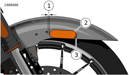 2. | יש לנקות ולהכין משטחים משני צידי הפגוש הקדמי. הערה See Figure 7. הרפלקטור צריך להיות ממוקם כ-1/4 אינץ' (6.35 מ"מ) (1) מהמסמרת ומיושר לקצה הפגוש התחתון (3). a. לקלף את הציפוי מהסרט. התקן רפלקטור (2) במקום (3) על המזלג כפי שמוצג. לחץ בחוזקה למקום. b. החזק את מחזיר האור במקומו תוך הפעלת לחץ יציב במשך דקה אחת לפחות. | |