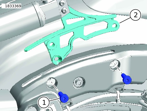 2. | הסר את תושבת המיכל החיצוני של ציוד מקורי (OE) (2). a. אל תסיר או תשחרר אף אחד מהצינורות או הברגים של המיכל החיצוני. | |