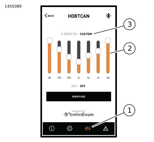 4. | 參見圖 18。等化器設定畫面。 a. 等化器設定圖示(1)。 b. 調整 7 頻段等化器(2)頻率。 c. 自訂或預設等化器選項(3)。 |