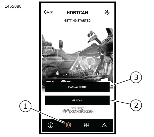 3. | Zie Afbeelding 17. Instellingenmenuscherm. a. Instellingenmenupictogram (1). b. Gebruik om de QR-code (2) op het instructieblad te scannen. c. Handmatige installatie voor stage 1- of 2-luidsprekers, luidsprekerlocatie en witte ruis om luidsprekerlocaties toe te wijzen. |