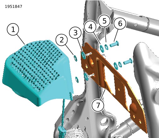 | 2. | Lihat Gambar 3. Pasang rakitan Kipas CoolFlow. a. Dari dalam area baki baterai, pasang sekrup (6), ring pengunci (5), dan ring pipih (4) melalui balok lintang rangka (7). b. Dari area powertrain, pasang ring pipih (3) dan klip penahan (2). c. Ulangi pemasangan perangkat keras di lubang pemasangan lainnya. d. Posisikan rakitan kipas (1) ke balok lintang rangka (7). e. Pasang sekrup (6) ke kipas (1). Kencangkan. Torque: 16 N·m (12 ft-lbs) |