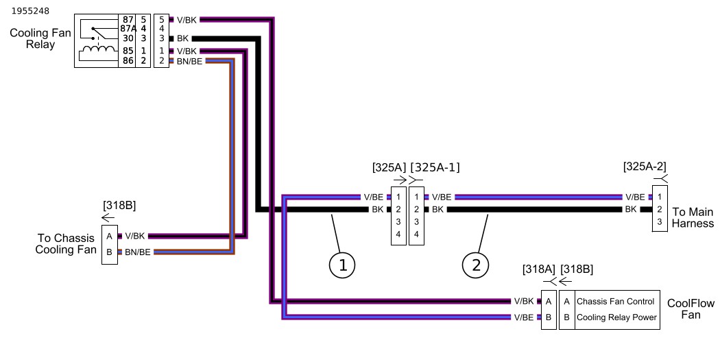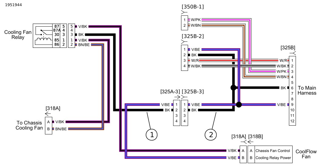 | 2. | Hubungkan Harnes Kabel kit (No. Komponen 69203452) ke Harnes Jumper (No. Komponen 69203453). a. Lihat Gambar 10. Temukan P&A 3 arah [325B] (1) di bawah penutup sisi kanan dan putuskan sambungan. b. Lihat Gambar 9. Hubungkan Harnes Jumper (No. Komponen 69203453) 3 arah [325A-2] ke P&A kendaraan [325B]. c. Lihat Gambar 4. Temukan kipas pendingin sasis [318]. d. Lihat Gambar 5. Hubungkan [318B] ke [318A]. e. Hubungkan 4-pin abu-abu [325A-3] ke [325B-3]. f. Hubungkan 2-pin [318C] ke Kipas CoolFlow [318D]. g. Kencangkan harnes dengan pengikat kabel yang disediakan di area antara kotak baterai dan rangka. |