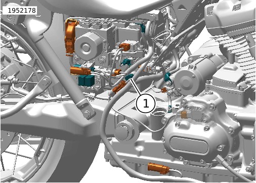 | 1. | Pasang Kabel Harnes (No. Komponen 69203486). Lihat Persyaratan Pemasangan. a. Lihat Gambar 6. Temukan P&A 12 arah [325A] (1) di bawah sadel dan lepaskan sumbat tutup. b. Lihat Gambar 5. Hubungkan Harnes Jumper (No. Komponen 69203486) 12 Arah [325B] ke P&A kendaraan [325A]. c. Rutekan dua abu-abu 4 arah [325B-2] dan [325B-3] di bawah area penutup sisi kanan. d. Lepas sumbat tutup bertanda merah [325B-3] |