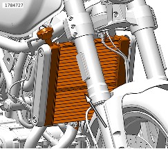 NOTICE Using a pressure washer to clean radiators or oil coolers can damage cooling fins and reduce airflow. Reduced airflow can lead to overheating, resulting in motorcycle damage. (00056c) NOTICE Clean the inlet surface of the radiator regularly. Leaves and other debris can collect on the radiator surface and degrade radiator performance which could lead to overheating and motorcycle damage. (00197d) | ||