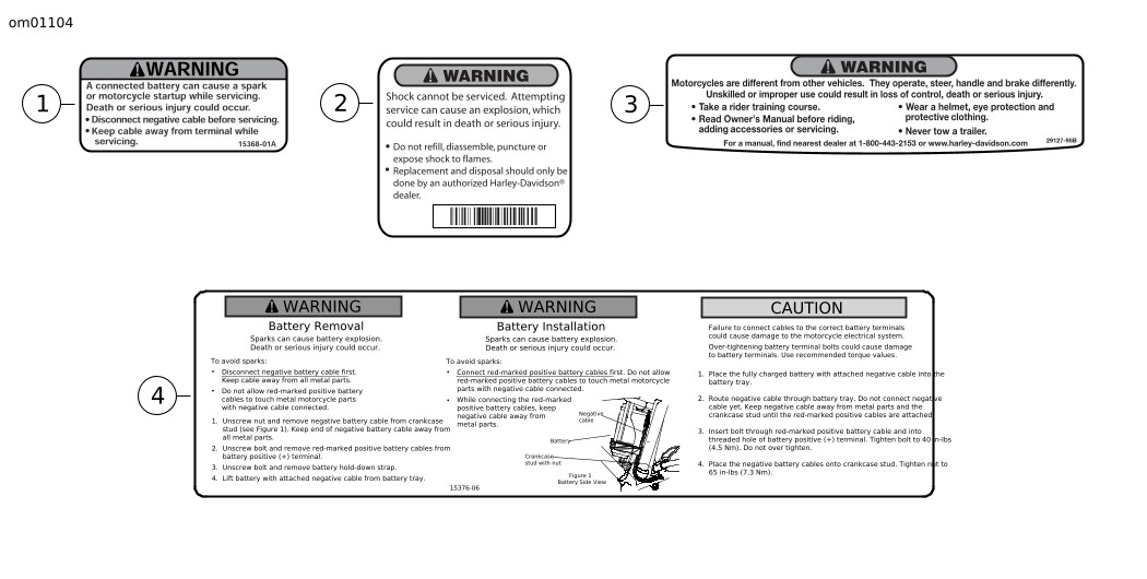 1 | 15368-01A | Battery warning | Top of belt guard (XR models) Left side of swingarm (XL models) |