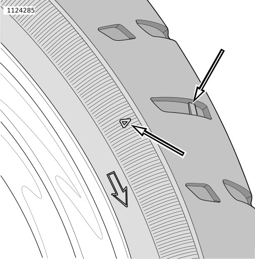 בעת התקנת צמיגים על חישוקים, אין להסתמך על תיכון הסוליה לצורך קביעת כיוון הסיבוב. ודא תמיד שחיצי הסיבוב היצוקים בדפנות מצביעים בכיוון הסיבוב כאשר הרכב נע קדימה.