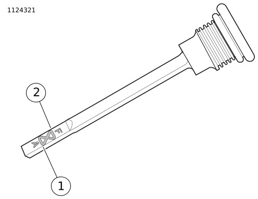 4. | ראה איור 2 . הסר את פקק המילוי/מדיד השמן. בדוק את מפלס נוזל הסיכה על המדיד. מפלס השמן תקין כשהוא בין סימן הוסף (A) (1) לבין מלא (F) (2). | |