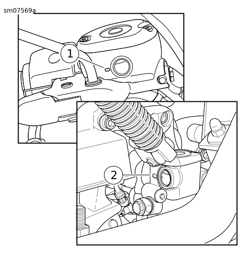 בלמים אחוריים: מקם את האופנוע כך שמיכל משאבת הבלם הראשית יהיה במצב אופקי. ודא כי מפלס הנוזל נראה לעין דרך החלון (2).