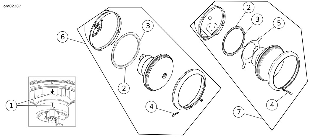 3. | ראה איור 2. מקם את החץ עם הכיתוב TOP שבשרוול הגומי מול החץ ברפלקטור (1). התקן את שרוול הגומי על הדקי המזלג של הנורה. לחץ על שרוול הגומי כדי להוציא ממנו את האוויר ולאטום את העדשה ואת מכלול הרפלקטור. | |