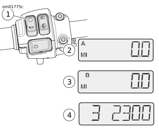 איור 2 . כדי לבדוק או לאפס את מוני מרחק הנסיעה, לחץ ושחרר את מתג TRIP (1) כדי להציג את מונה מרחק הנסיעה A (2) או B (3). האות A או B בפינה העליונה השמאלית של הצג מציינת איזה מונה מרחק נסיעה מוצג.