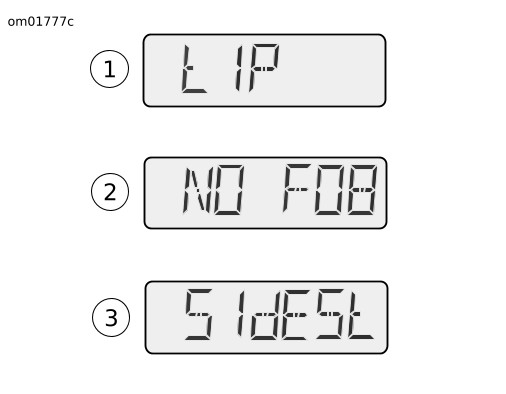 ראה איור 2. אם באופנוע יש מערכת אבטחה ומישהו נסע והשאיר מאחור את מחזיק המפתחות, ההודעה ”NO FOB“ (אין מחזיק מפתחות; 2) מוצגת בצג מד המרחק כשהאופנוע מתחיל להתרחק. התצוגה נמשכת 10 שניות כתזכורת שיש להחזיר את מחזיק המפתחות.