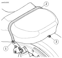 5. | התקן את בורג ההתקנה של המושב (3). הדק ל-5.4–8.1 N·m (48–72 in-lbs). הערה אם אום נעילת המושב ניזוקה או אבדה, עיין במדריך השירות. | |