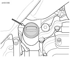 איור 2. הסר את פקק המילוי/מדיד השמן. באמצעות קו המדידה על המדיד, המסומן כ- FULL HOT VEHICLE UPRIGHT (מלא, רכב חם במצב זקוף), בדוק את מפלס השמן. מפלס השמן הנכון אמור להיות באמצע (2) בין סימוני ”ADD QT“ (הוסף כ-1 ליטר) ל-“FULL HOT“ (מלא, רכב חם) על גבי מדיד השמן.