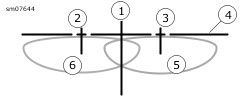 5. | ראה איור 2. כסה את הפנס הראשי הימני. כוונן את הפנס הראשי השמאלי כך שהחלק העליון של האזור בעצמה גבוהה (6) נמצא בקו אופקי (4) או מתחתיו, וממורכז תחת קו האמצע השמאלי (2). | |