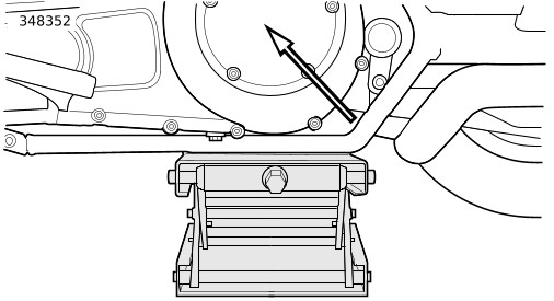 איור 2. בעת הרמת החלק האחורי, דאג שהצמיג הקדמי יישאר מאובטח במקומו בעזרת מתקן אחיזה לגלגלים. אבטח את הקצה הקדמי למתקן הרמת האופנוע באמצעות רצועות. מקם את המגבה מתחת לחלק האחורי של המסגרת, ממורכז בקירוב תחת מכסה המצמד. ודא כי הוא נוגע בחישולי צינורות המסגרת בשני הצדדים.
