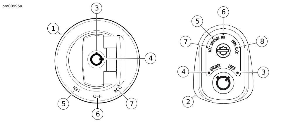 Harley-Davidson ממליצה להוציא את המפתח מההצתה/מנעול המזלג לפני הפעלת האופנוע. אם אין מסירים את המפתח, הוא עלול ליפול במהלך הפעלת האופנוע.