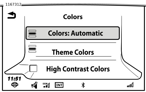 2. | Consultez Figure 1.. Appuyez sur le bouton de sélection multiple des Couleurs jusqu'à ce que le mode de couleur désiré s’affiche. a. Couleurs de jour : L’écran affiche des couleurs plus vives. b. Couleurs de nuit : L’écran affiche des couleurs moins vives et plus tamisées. La carte de navigation est également affichée en couleurs de nuit. Il est impossible de choisir d’autres couleurs d’arrière-plan lorsque la radio est en mode de couleurs de nuit. c. Couleurs automatiques : L’écran ajuste automatiquement les modes de couleur jour/nuit en fonction de la lumière ambiante qui est mesurée par un capteur situé dans le compteur de vitesse. |