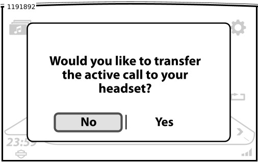 Si un appel est en cours et que la motocyclette est arrêtée, la radio demandera à l’utilisateur l’autorisation de transférer l’appel vers le téléphone comme illustré dans