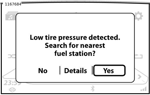 Rechercher une station-service : pour les véhicules dotés d’un système de navigation, la radio vous incitera à vous rendre à la station-service la plus proche. Sélectionner Yes (Oui) pour afficher une liste de stations-service à proximité.