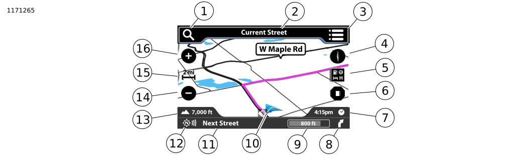 11. | Barre Informations audio : ACTIVER/DÉSACTIVER*. a. Affiche la source audio en cours le long du bas de la carte. | |