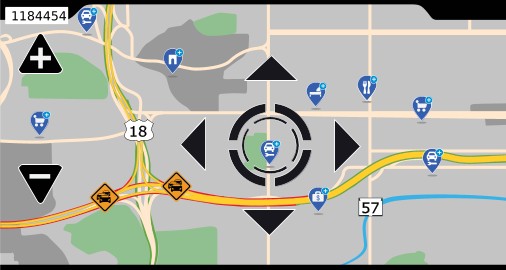 1. | Une fois la carte affichée, appuyez sur l'écran tactile. L’outil de défilement (cercle avec flèches) est indiquée sur la carte. La barre de titre affiche le nom de la rue qui est en cours de visualisation. | |